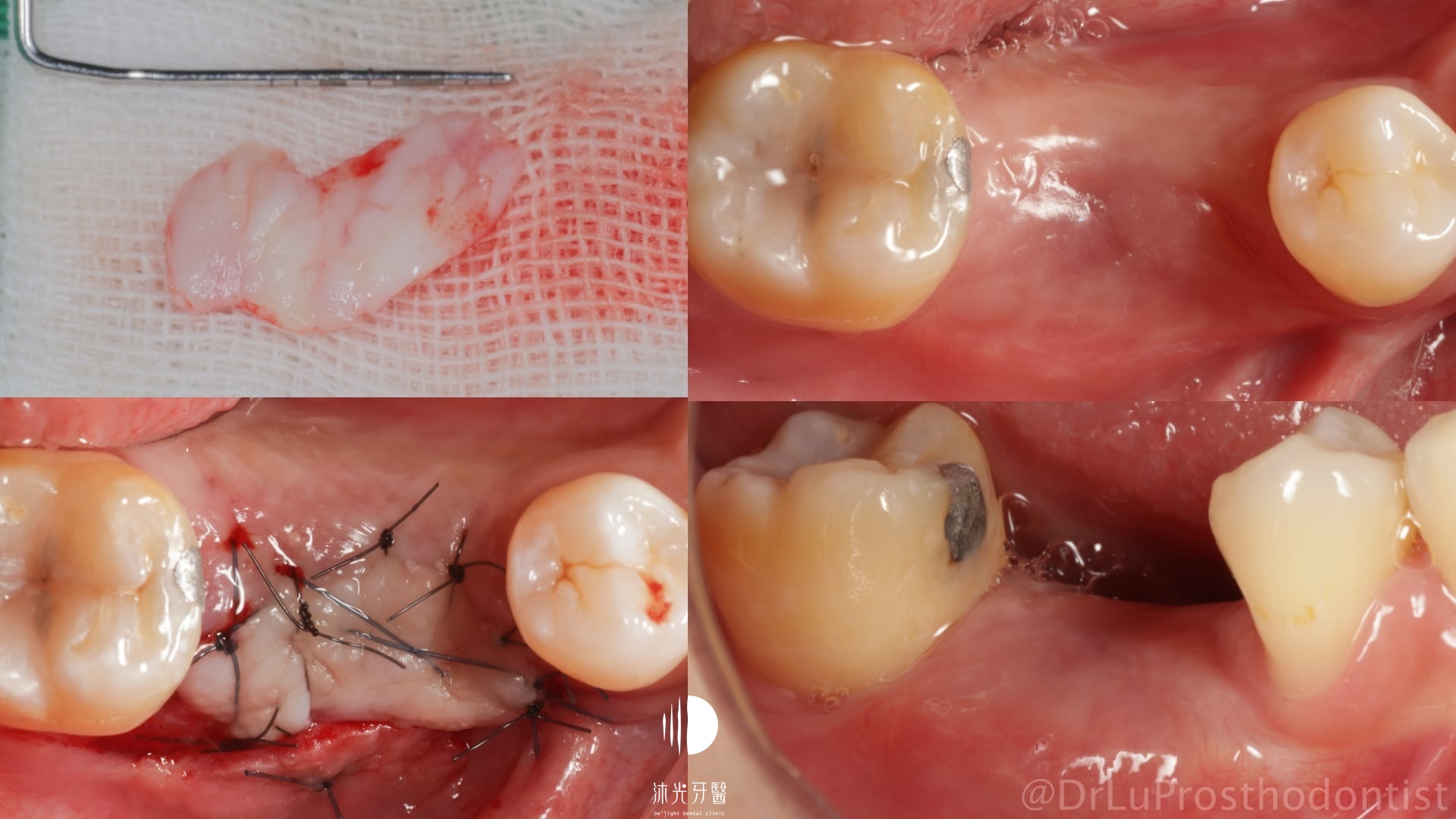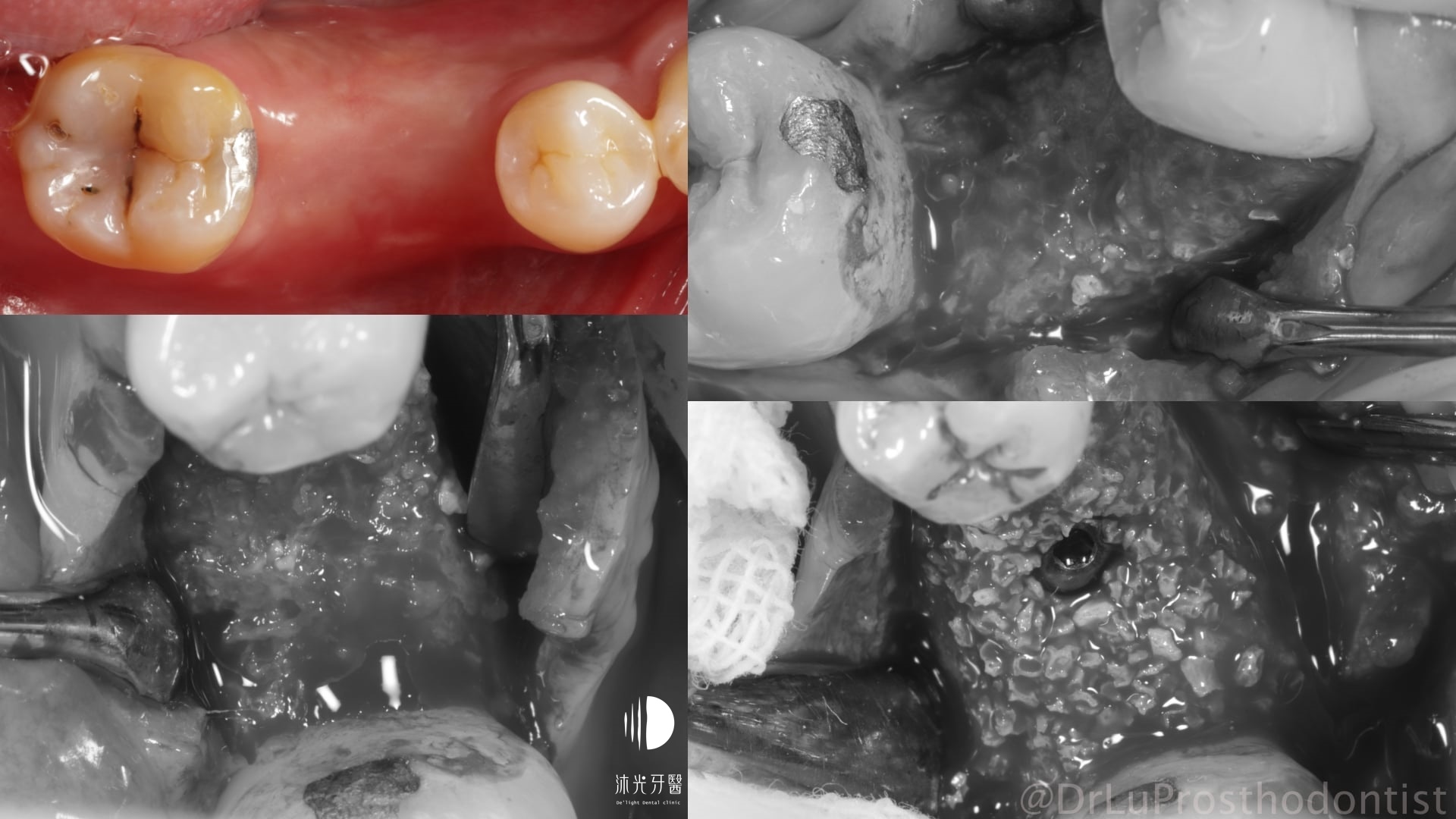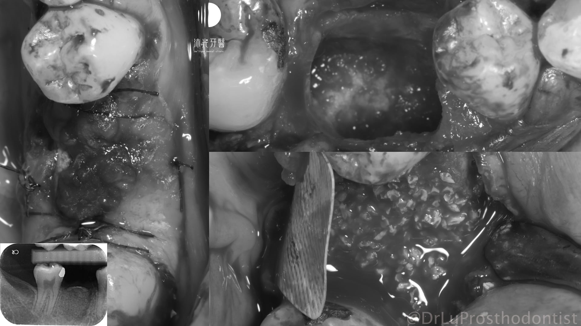 X光及口內檢查可知齒槽骨長期發炎感染後嚴重吸收,拔牙當下整個拔牙窩就像一個大窟窿,裡面滿是感染形成的肉芽組織。整個植牙重建過程也沒辦法像一般患者這麼輕鬆(戲稱植牙重建的吃全餐),從拔牙清創補骨、植牙、補牙齦將缺失的組織一一重建好,才能完成接近自然牙狀態的植牙贋復。